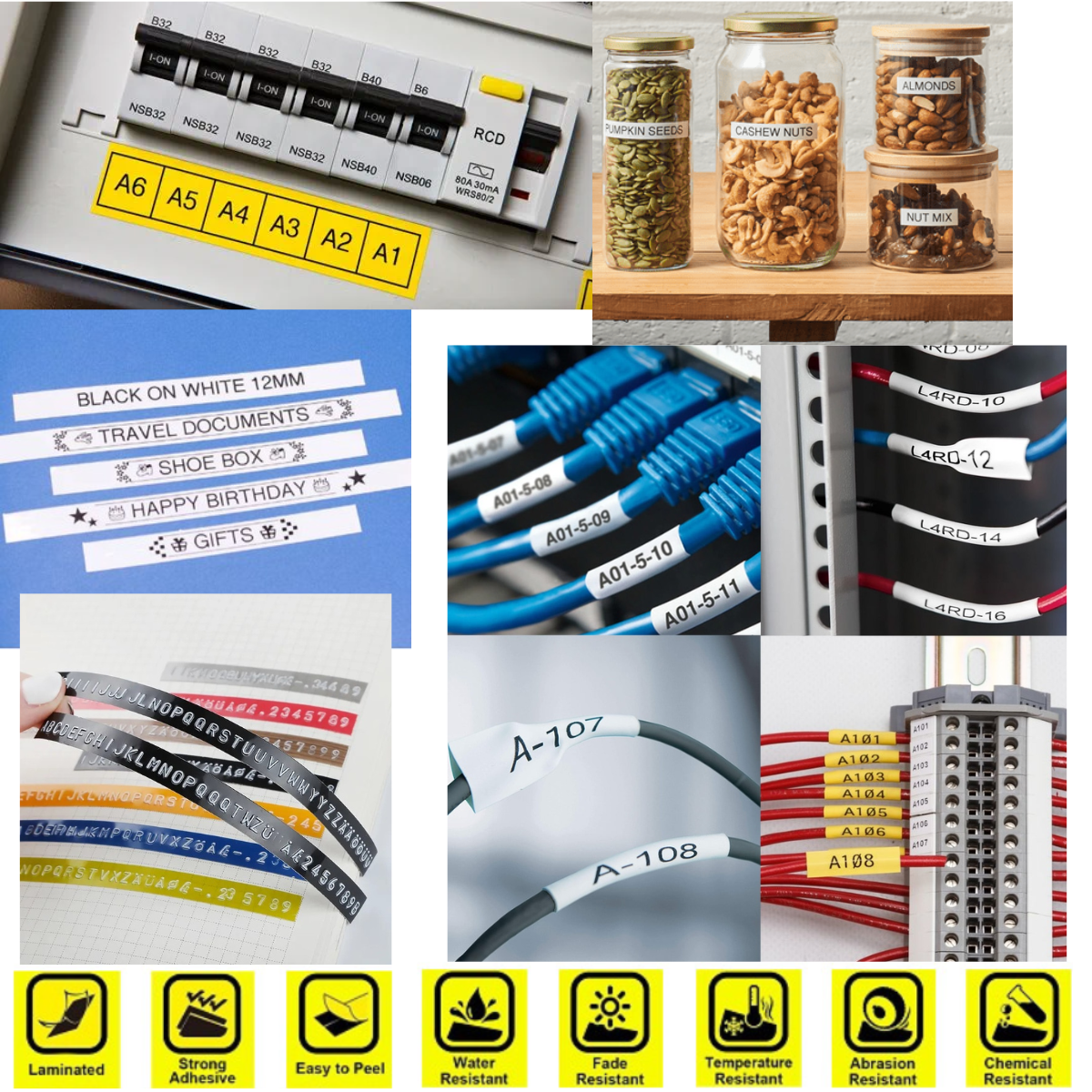 📌 Rotular es identificar productos, cables, ropa o útiles, etc con textos de 1 a 4 líneas, símbolos, códigos de barras o códigos QR. Se usa una rotuladora electrónica portátil o de escritorio con cintas de distintos anchos (6, 9, 12, 18, 24 y 36 mm).